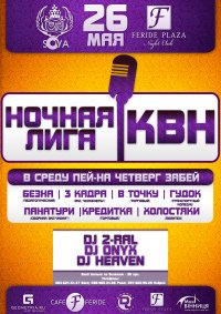 ![]() Уважаемые Друзья!!! 26 мая 2010 года в ночном клубе "Фериде Плаза" пройдёт 1-я игра ночной лиги КВН. За победу будут сражаться: команда "БЕЗНА" - Педагогический универ. команда "3 КАДРА" - экс "Инженеры" команда "В ТОЧКУ" - Торговый команда "ГУДОК" - Транспортный коледж команда "ПАНАТУРИ" - Сборная экс "ЖЕНЯ" команда "КРЕДИТКА" - Торговый команда "ХОЛОСТКИ" - Политех Море позитива, тонна хорошего настроения и буря истерического хохота обеспечена!!! Вход на вечеринку исключительно по флаерам. Стоимость флаера составляет 30 гривен. По всем вопросам обращайтесь: 8(096)98-32-715 - Юрчик; 8(097)600-90-29 - Андрей. |